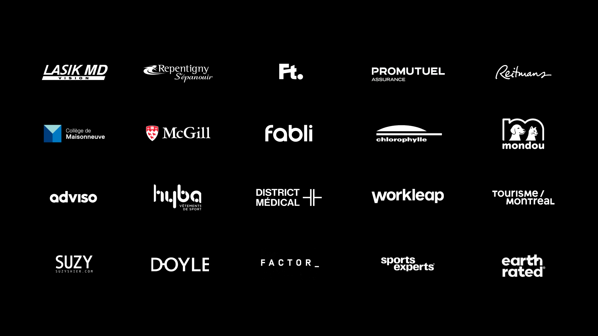 ADVISO . AGENCE FEATURING . COLLÈGE DE MAISONNEUVE . DISTRICT MEDICAL . EARTH RATED . EXCELLENCE QUEBEC . MCGILL DESAUTELS . PROMUTUEL ASSURANCES . RAPHAËL U . REITMANS . SPORTS EXPERTS . LE CHIFFRE . LIEBERMAN TRANCHEMONTAGNE . MIEL D'ANICET . WORKLEAP (GSOFT)